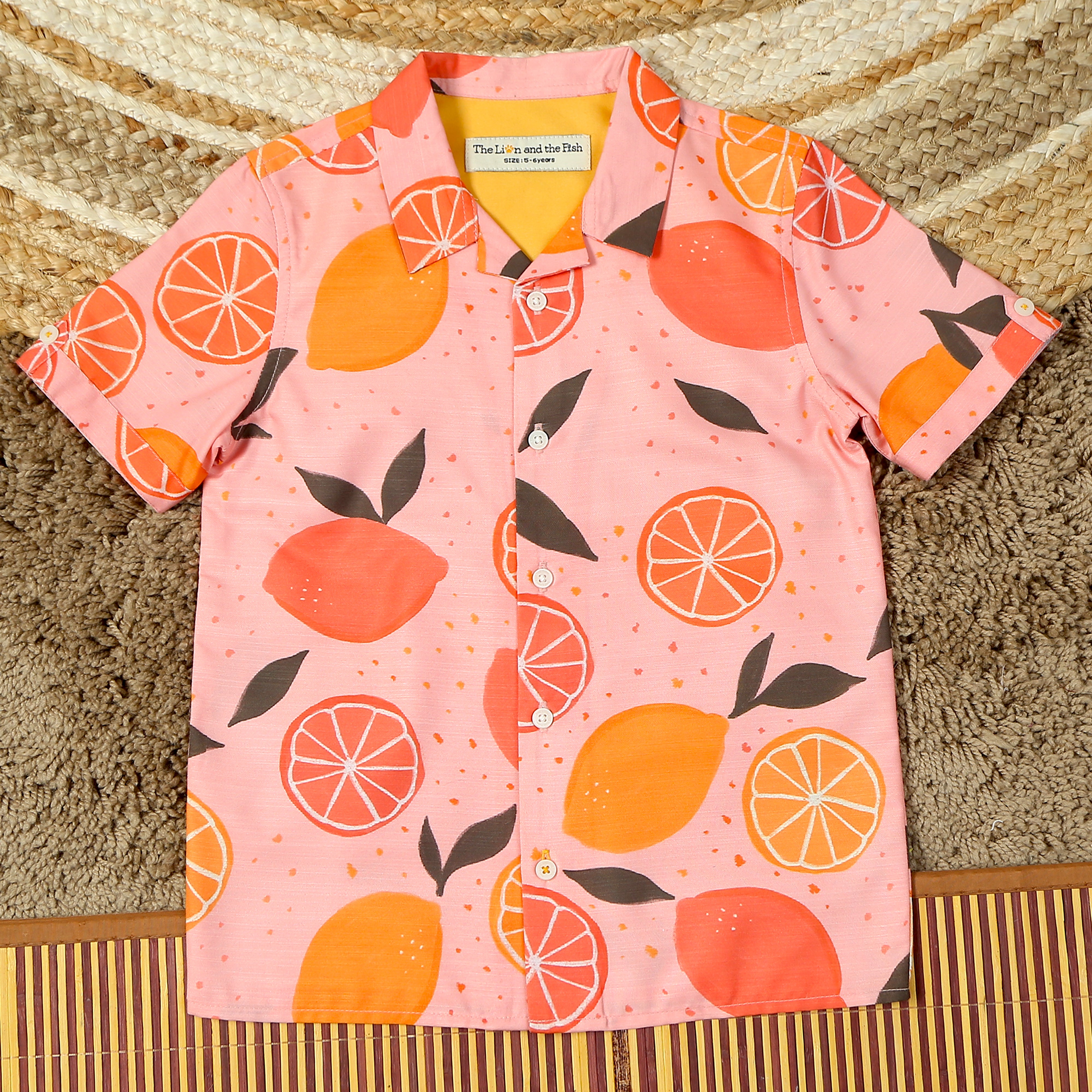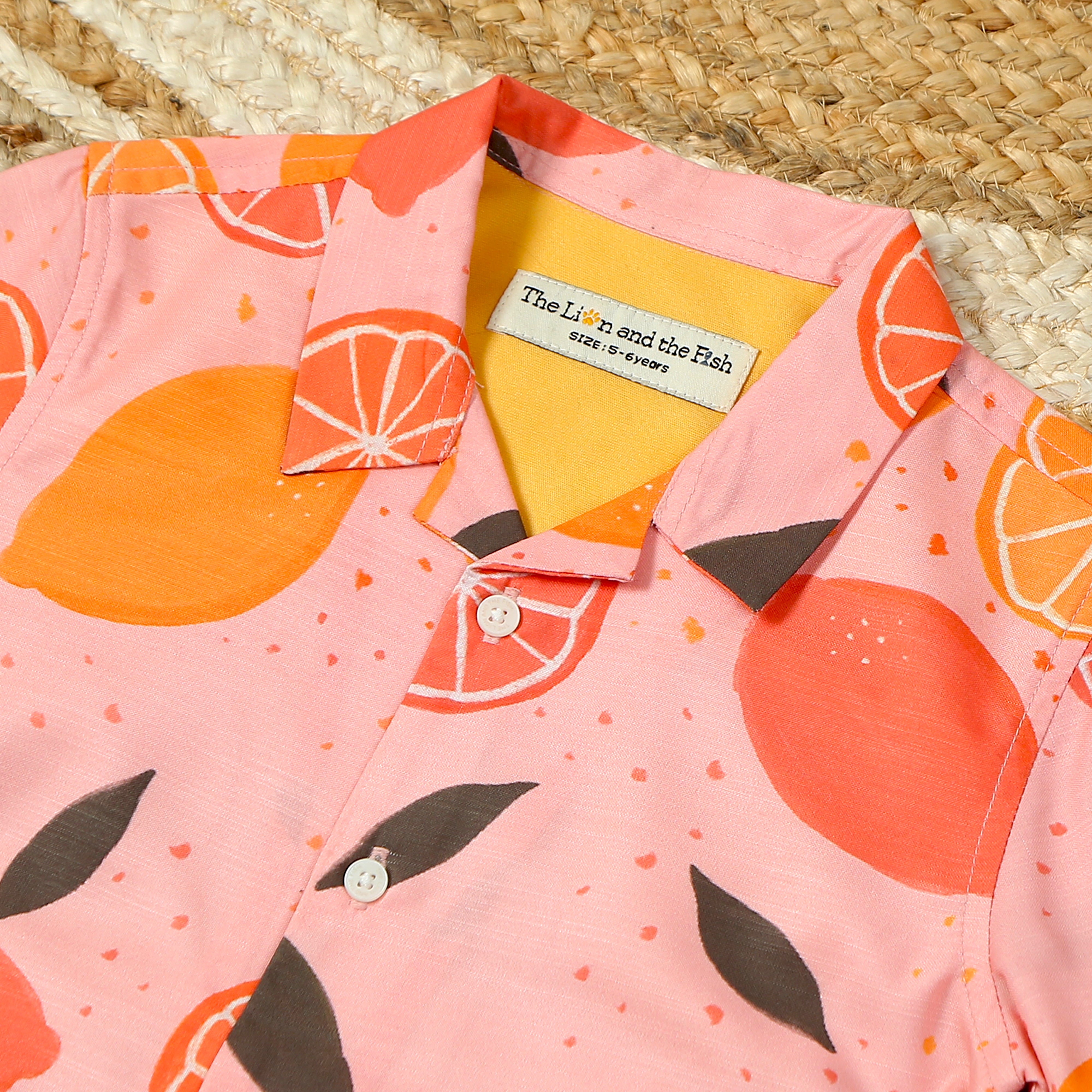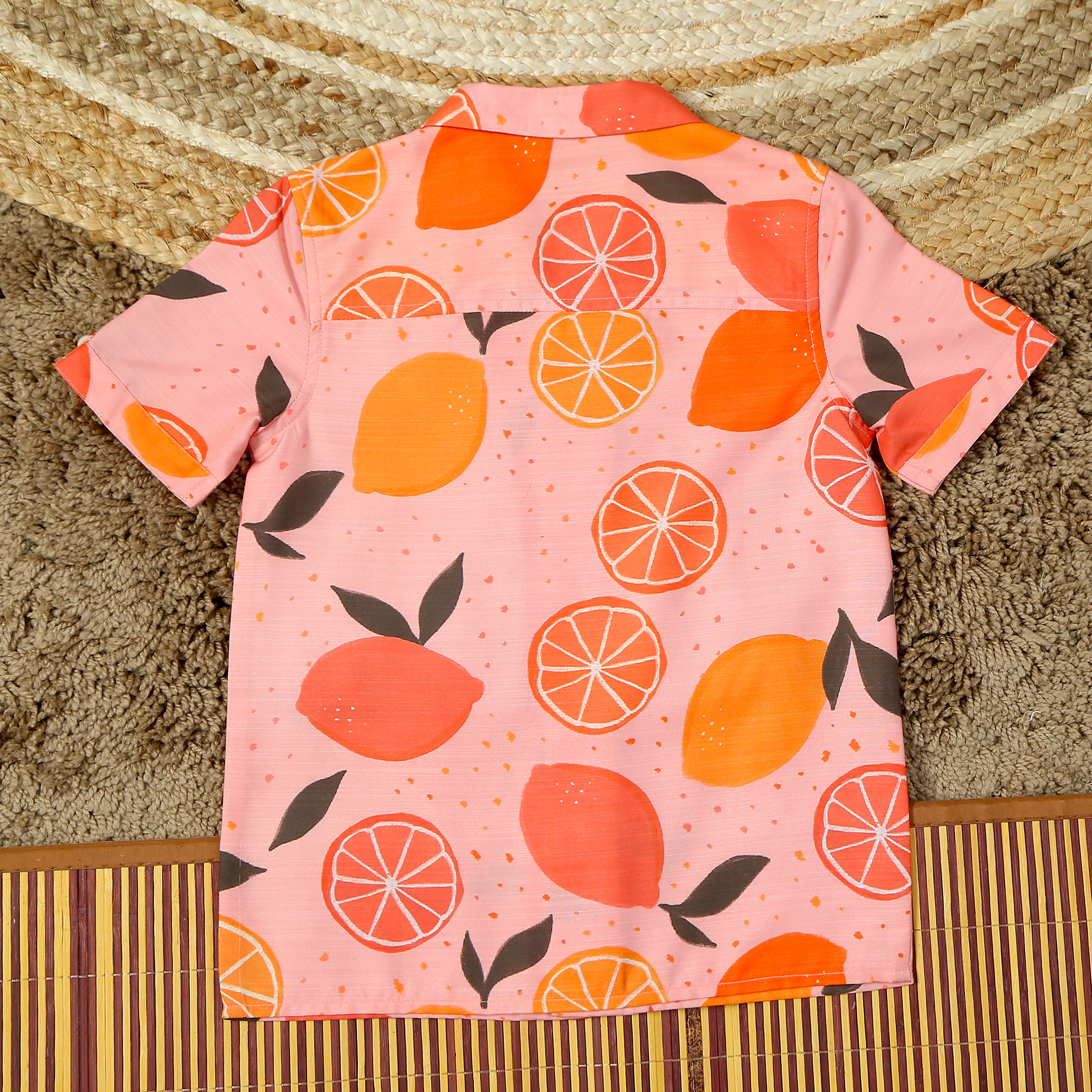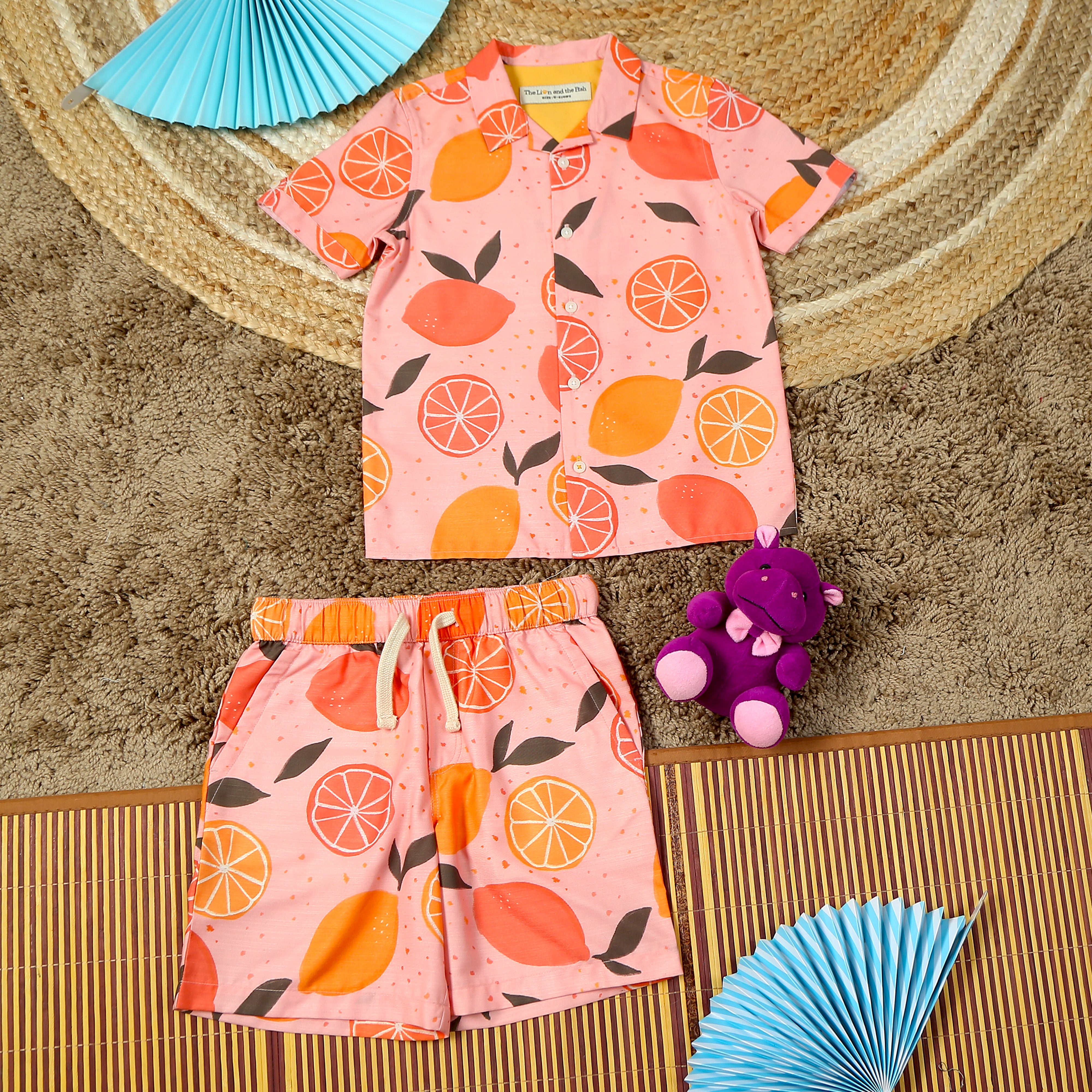 Boys & Girls Unisex Lemon Printed Shirt & Short Co-Ord Set Peach Mustard